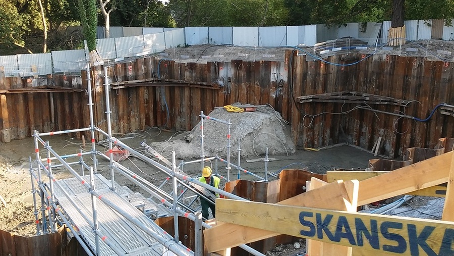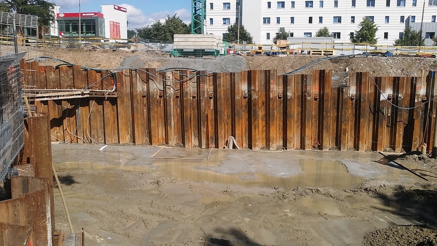 Wykonano zabezpieczenie wykopu ściankami szczelnymi sięgającymi do pierwszej warstwy nieprzepuszczalnej. Jednak w jednym z naroży wykopu obudowa była niezupełna. W tej strefie wykop był stale zasilany przez wody gruntowe.